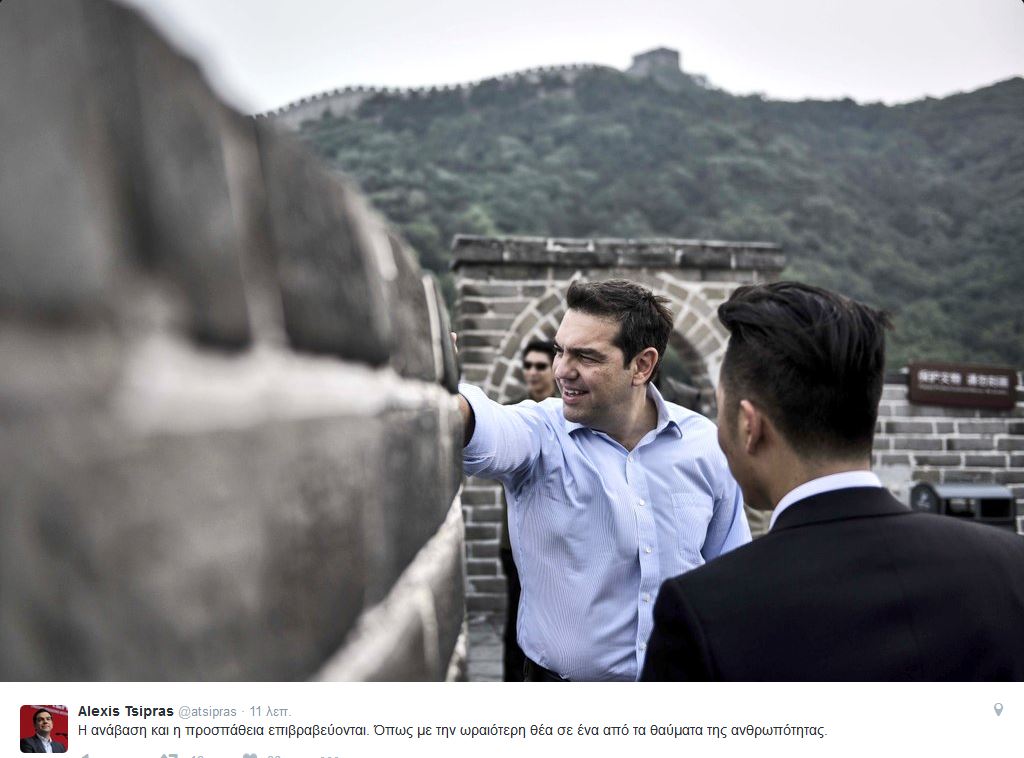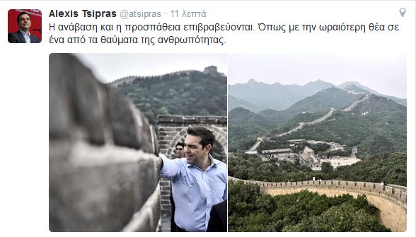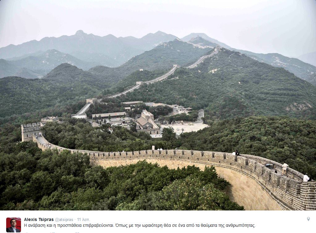 «Η ανάβαση και η προσπάθεια επιβραβεύονται», έγραψε ο Αλέξης Τσίπρας στο Twitter, ανεβάζοντας δύο φωτογραφίες από το Σινικό Τείχος.