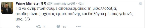 «Για να αντιμετωπίσουμε αποτελεσματικά τη μισαλλοδοξία, οικοδομώντας σχέσεις εμπιστοσύνης και διαλόγου με τους γείτονές μας», προσθέτει ο κ. Τσίπρας.