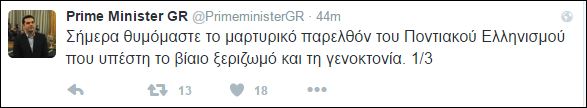 «Σήμερα θυμόμαστε το μαρτυρικό παρελθόν του Ποντιακού Ελληνισμού που υπέστη τον βίαιο ξεριζωμό και τη γενοκτονία», τονίζει ο Πρωθυπουργός, Αλέξης Τσίπρας, μέσω του προσωπικού του λογαριασμού στο Twitter.