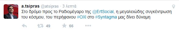 Τη συγκέντρωση υπέρ του «όχι» στην πρόταση των δανειστών, που βρίσκεται σε εξέλιξη αυτή την ώρα στο Σύνταγμα, σχολίασε ο Πρωθυπουργός Αλέξης Τσίπρας, με ανάρτηση που έκανε στο Twitter. Συγκεκριμένα, ο κ. Τσίπρας έγραψε: «Στο δρόμο προς το Ραδιομέγαρο της ΕΡΤ, η μεγαλειώδης συγκέντρωση του κόσμου, του περήφανου “OXI” στο Σύνταγμα μας δίνει δύναμη.