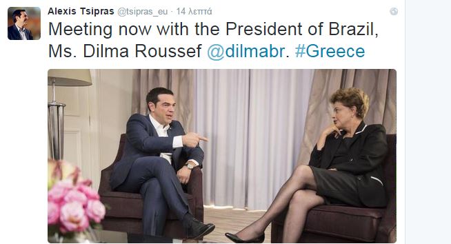 Φωτογραφία από τη συνάντησή του με την Πρόεδρο της Βραζιλίας, Ντίλμα Ρούσεφ, ανήρτησε στον προσωπικό του λογαριασμό στο Twitter, o Πρωθυπουργός Αλέξης Τσίπρας, στο περιθώριο της Συνόδου ΕΕ – CELAC, στις Βρυξέλλες.
