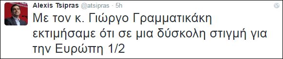 Τη συνάντησή του με τον Ευρωβουλευτή του Ποταμιού Γιώργο Γραμματικάκη στις Βρυξέλλες, σχολίασε ο Πρωθυπουργός, Αλέξης Τσίπρας, μέσω του προσωπικού του λογαριασμού στο Twitter.