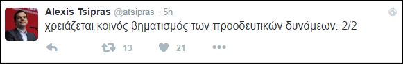 «Mε τον κ. Γιώργο Γραμματικάκη εκτιμήσαμε ότι σε μια δύσκολη στιγμή για την Ευρώπη οι προοδευτικές δυνάμεις πρέπει να βάλουν τη σφραγίδα τους στις εξελίξεις», έγραψε στην ανάρτησή του ο κ. Τσίπρας και πρόσθεσε: «Χρειάζεται κοινός βηματισμός των προοδευτικών δυνάμεων».