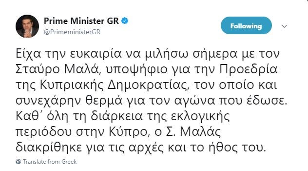 Όπως αναφέρει ο πρωθυπουργός σε ανάρτηση του στο Twitter: «Είχα την ευκαιρία να μιλήσω σήμερα με τον Σταύρο Μαλά, υποψήφιο για την Προεδρία της Κυπριακής Δημοκρατίας, τον οποίο και συνεχάρην θερμά για τον αγώνα που έδωσε. Καθ΄ όλη τη διάρκεια της εκλογικής περιόδου στην Κύπρο, ο Σ. Μαλάς διακρίθηκε για τις αρχές και το ήθος του».