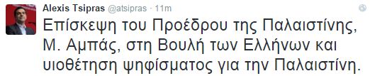 Φωτογραφίες από την επίσκεψη του Προέδρου της Παλαιστίνης, Μαχμούντ Αμπάς, στη Βουλή ανέβασε στον λογαριασμό του στο twitter o Πρωθυπουργός, Αλέξης Τσίπρας.