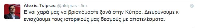 Την χαρά του για την επίσκεψη του στην Κύπρο εκφράζει ο Πρωθυπουργός Αλέξης Τσίπρας με ανάρτηση που έκανε στο Twitter. Συγκεκριμένα, ο κ. Τσίπρας έγραψε: «Είναι χαρά μας να βρισκόμαστε ξανά στην Κύπρο. Διευρύνουμε κ ενισχύουμε τους ιστορικούς μας δεσμούς με αποτελέσματα».