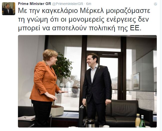 “Με την καγκελάριο Μέρκελ μοιραζόμαστε τη γνώμη ότι οι μονομερείς ενέργειες δεν μπορεί να αποτελούν πολιτική της ΕΕ” έγραψε ο κ. Τσίπρας στο Twitter, ανεβάζοντας την παρακάτω φωτογραφία.