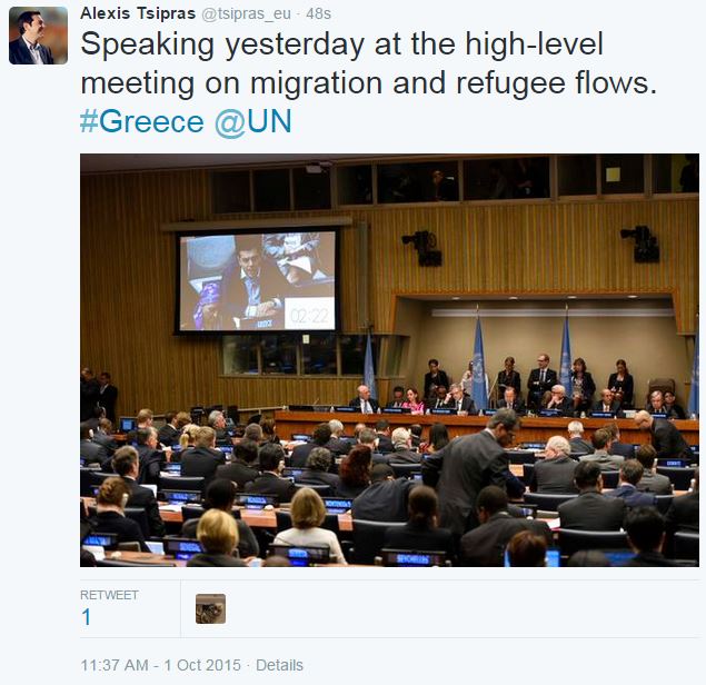Ο πρωθυπουργός Αλέξης Τσίπρας, κοινοποίησε στον προσωπικό του λογαριασμό στο twitter, μια φωτογραφία από την ομιλία του στην συνάντηση κορυφαίου επιπέδου για το μεταναστευτικό και τις προσφυγικές ροές.