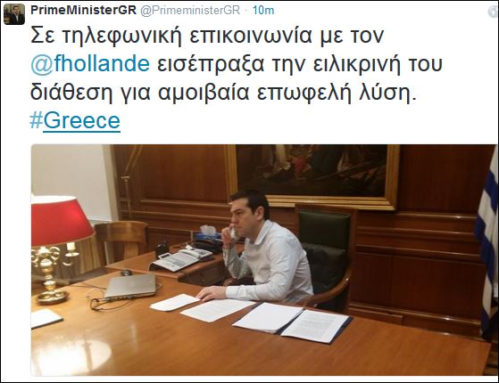 “Σε τηλεφωνική επικοινωνία με τον @fhollande εισέπραξα την ειλικρινή του διάθεση για αμοιβαία επωφελή λύση”, ήταν το σχόλιο του Πρωθυπουργού.