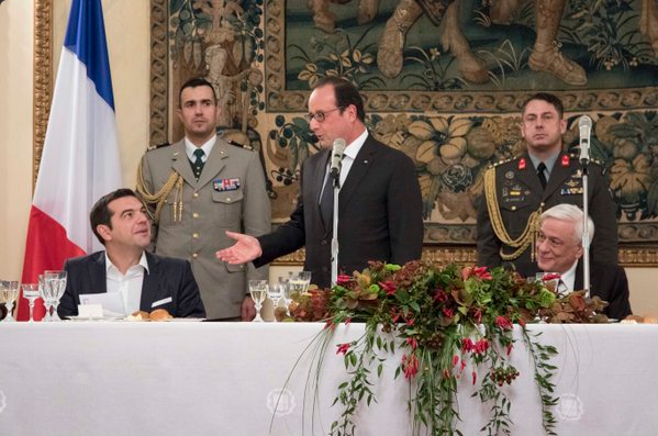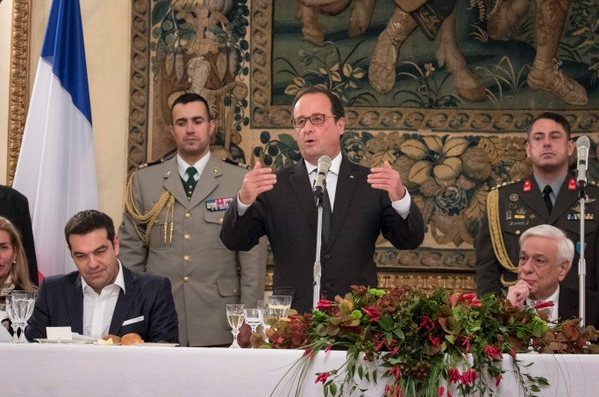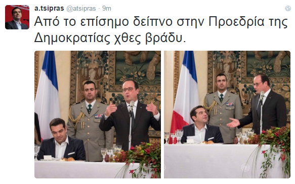 Δύο φωτογραφίες από το δείπνο που είχε με τον Γάλλο Πρόεδρο, Φρανσουά Ολαντ, στην Προεδρία της Δημοκρατίας, το βράδυ της Πέμπτης, ανέβασε σήμερα στο twitter ο πρωθυπουργός, Αλέξης Τσίπρας.