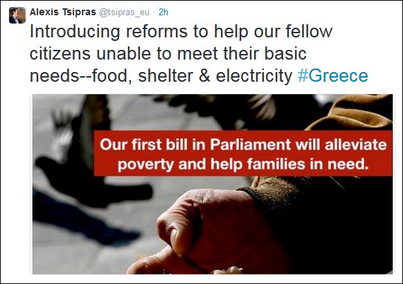 Το tweet συνοδεύεται από μία φωτογραφία στην οποία αναγράφεται: «Το πρώτο μας νομοσχέδιο στο Κοινοβούλιο θα ανακουφίσει από τη φτώχεια και θα βοηθήσει τις οικογένειες που έχουν ανάγκη».