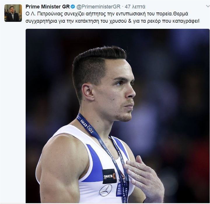«O Λευτέρης Πετρούνιας συνεχίζει αήττητος την εντυπωσιακή του πορεία. Θερμά συγχαρητήρια για την κατάκτηση του χρυσού και για τα ρεκόρ που καταγράφει!»Αυτό ανέφερε ο Πρωθυπουργός Αλέξης Τσίπρας με ανάρτηση του στον προσωπικό λογαριασμό του στο Twitter, με αφορμή το γεγονός ότι ο Έλληνας Ολυμπιονίκης των κρίκων αναδείχθηκε για τρίτη διαδοχική φορά πρωταθλητής Ευρώπης.