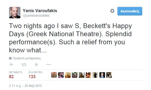 Ο υπουργός Οικονομικών, Γιάνης Βαρουφάκης, σχολίασε την έξοδό του στο θέατρο με ένα tweet, περιγράφοντας τις στιγμές χαλάρωσης.