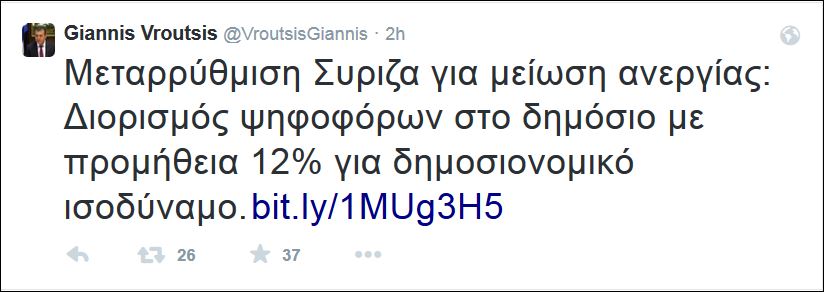 «Μεταρρύθμιση ΣΥΡΙΖΑ για μείωση ανεργίας: Διορισμός ψηφοφόρων στο δημόσιο με προμήθεια 12% για δημοσιονομικό ισοδύναμο» γράφει ο κ. Βρούτσης στο twitter.
