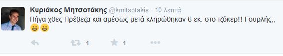 Με έναν χιουμοριστικό τρόπο σχολίασε ο υποψήφιος για την ηγεσία της Νέας Δημοκρατίας, Κυριάκος Μητσοτάκης, τη στάση του στην Πρέβεζα για την προεκλογική του περιοδεία με το χθεσινό νικητήριο δελτίο τζόκερ που κληρώθηκε στην πόλη.