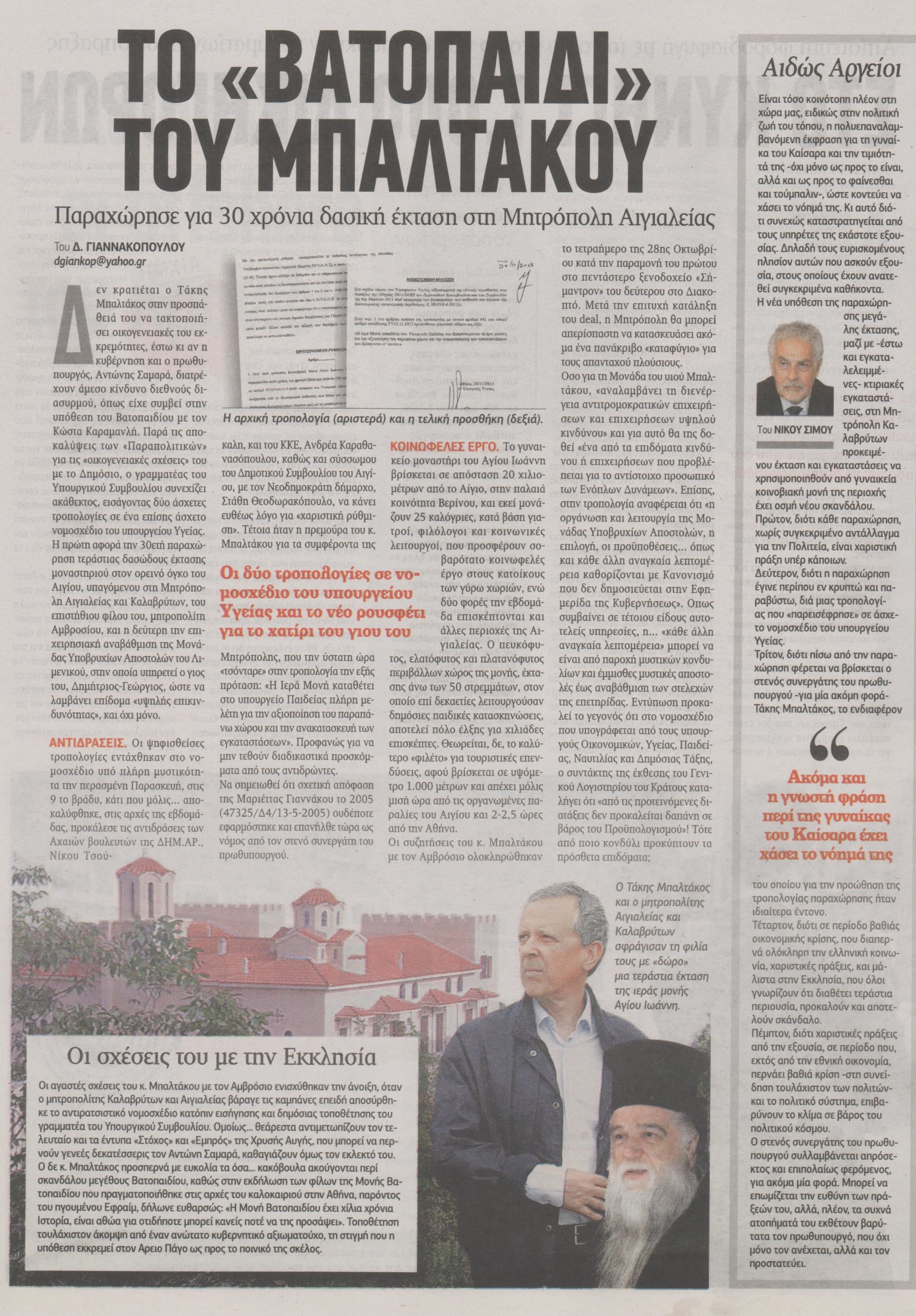 Τέτοια ήταν η πρεμούρα του κ. Μπαλτάκου για τα συμφέροντα της Μητρόπολης, που την ύστατη ώρα «τσόνταρε» στην τροπολογία την εξής πρόταση: «Η Ιερά Μονή καταθέτει στο υπουργείο Παιδείας πλήρη μελέτη για την αξιοποίηση του παραπάνω χώρου και την ανακατασκευή των εγκαταστάσεων». Προφανώς για να μην τεθούν δικαστικά προσκόμματα από τους αντιδρώντες.