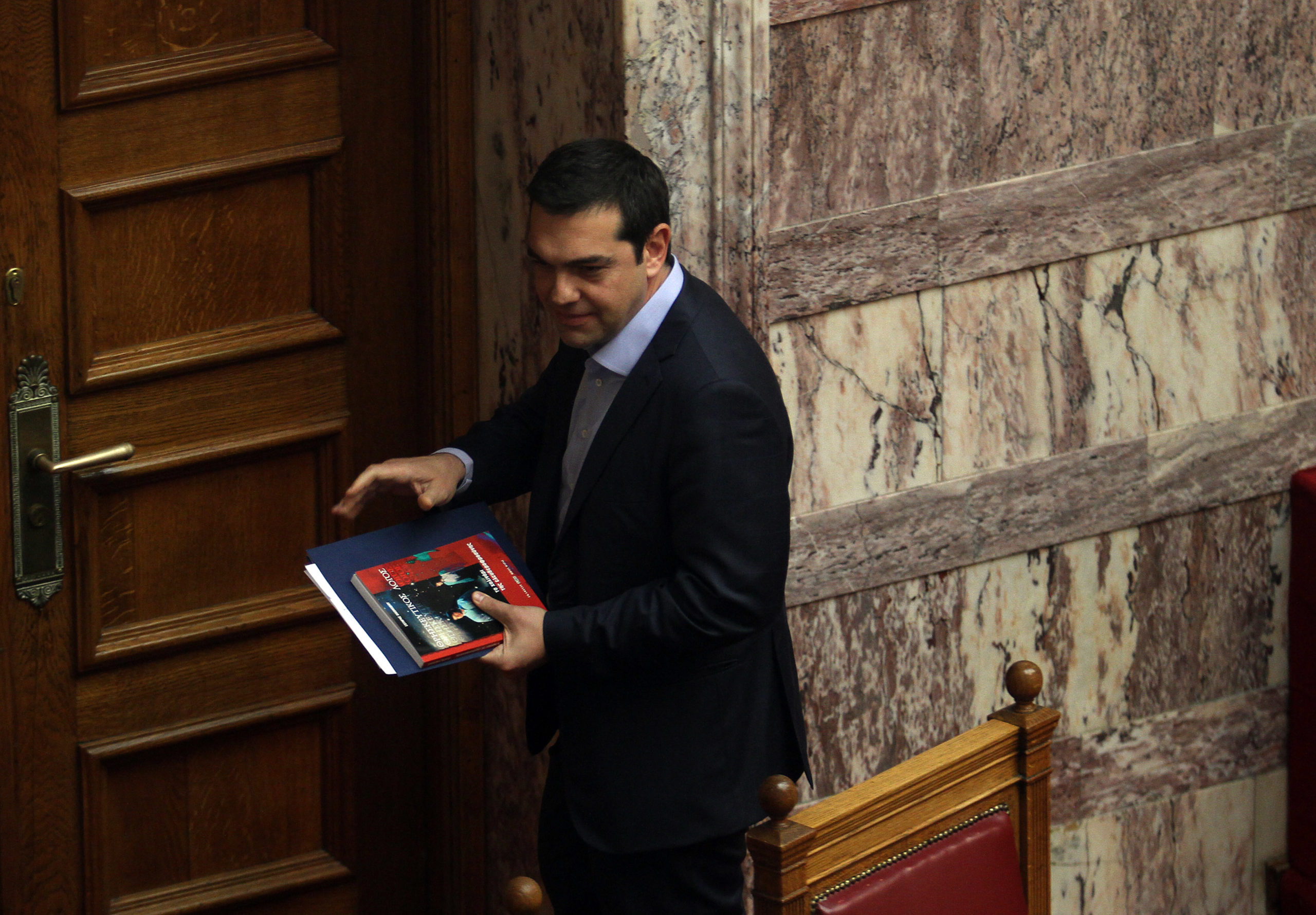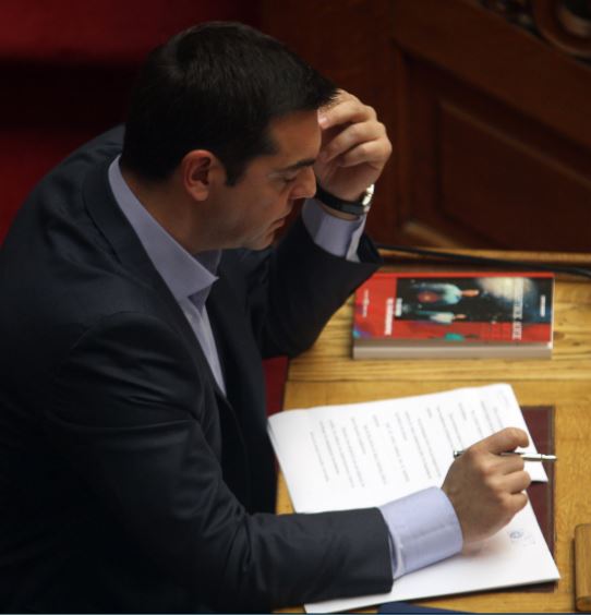 Δίπλα του διακρίνεται κι ένα βιβλίο το οποίο ο κ. Τσίπρας δεν αποχωρίστηκε, ούτε στιγμή και το οποίο πήρε μαζί του όταν αποχώρησε από την αίθουσα της βουλής.