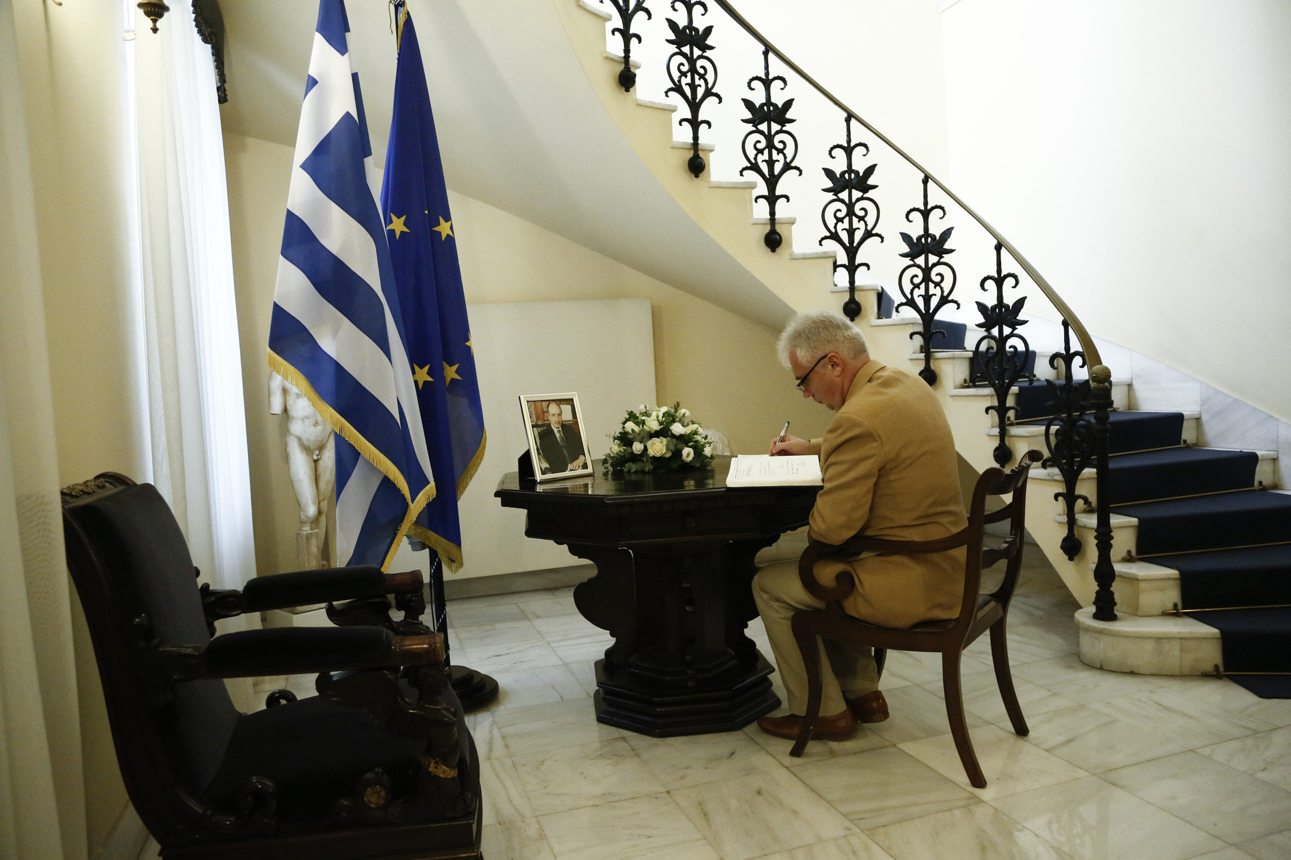 Ο πρέσβης της Ρουμανίας στην Αθήνα Lucian Fatu υπογράφει στο βιβλίο συλλυπητηρίων για τον θάνατο του πρώην Προέδρου της Δημοκρατίας στο Προεδρικό Μέγαρο.