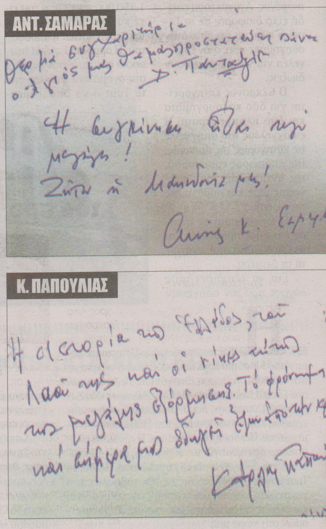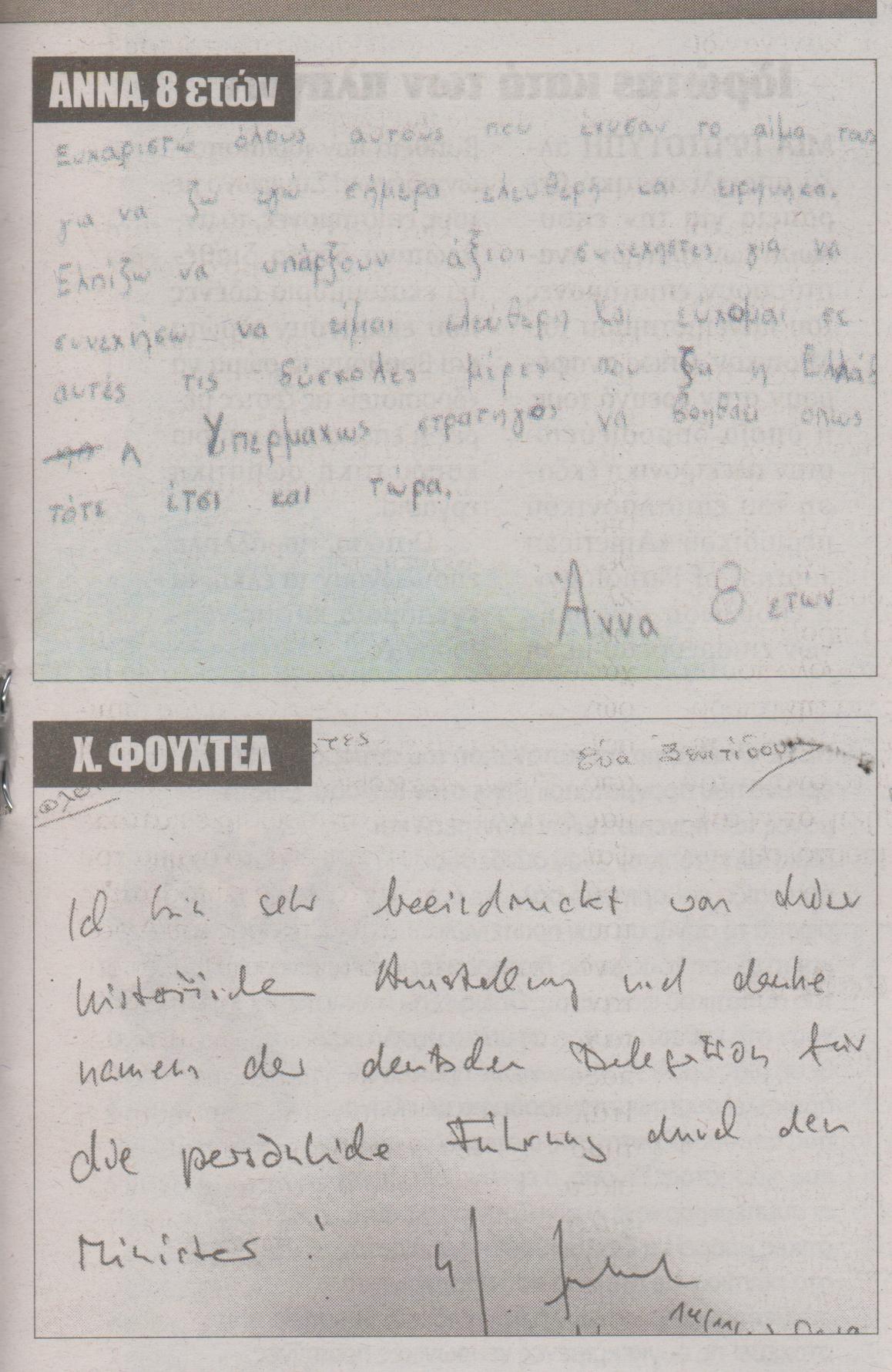 «Ευχαριστώ όλους αυτούς που έχυσαν το αίμα τους για να ζω εγώ σήμερα ελεύθερη και ειρηνικά. Ελπίζω να υπάρξουν άξιοι συνεχιστές, για να συνεχίσω να είμαι ελεύθερη». Αννα, οκτώ ετών.
