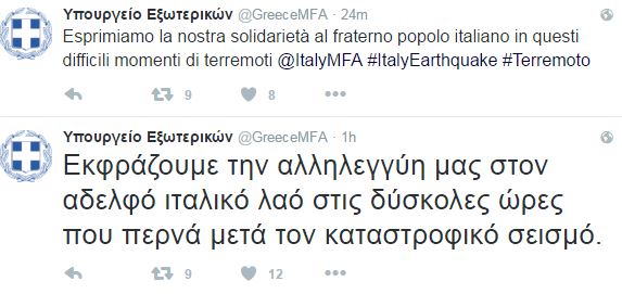 – «Εκφράζουμε την αλληλεγγύη μας στον αδελφό ιταλικό λαό στις δύσκολες ώρες που περνά μετά τον καταστροφικό σεισμό».