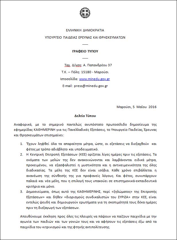 Τέλος, από πλευράς του υπουργείου, χαρακτηρίζεται «ψευδές» το δημοσίευμα και απευθύνεται έκκληση να μην παίζονται παιχνίδια με την αγωνία των παιδιών και των γονιών τους, αφήνοντας τις Πανελλαδικές «έξω από τα παιχνίδια του κιτρινισμού και της φτηνής αντιπολίτευσης».