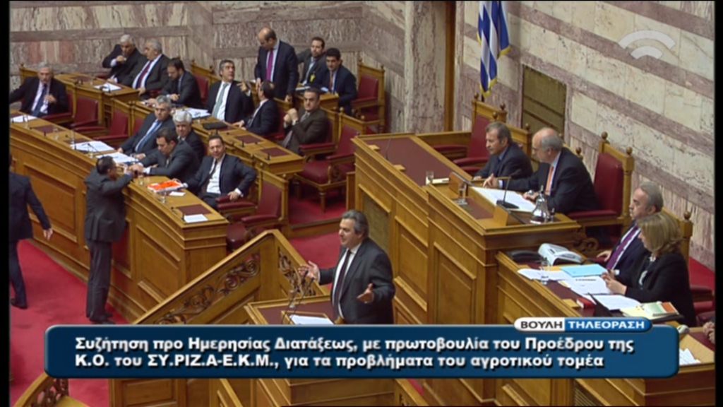 “Περίμενα να καλωσορίσω τον πρωθυπουργό στη βουλή για τρίτη φορά μετά την εκλογή του αλλά δεν είχα πάλι την τύχη. Δεν αποτελεί χώρος διαλόγου η βουλή, αλλά τα σαλόνια της τρόικας, τα κόκκινα χαλιά της κυρίας Μέρκελ και οι επίτροποι των υπουργείων”.