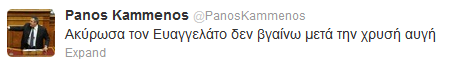 Ακυρώνει την εμφάνισή του στον Νίκο Ευαγγελάτο μέσω twitter, ο πρόεδρος των Ανεξάρτητων Ελλήνων, Πάνος Καμμένος, λόγω της παρουσίας των βουλευτών της Χρυσής Αυγής.