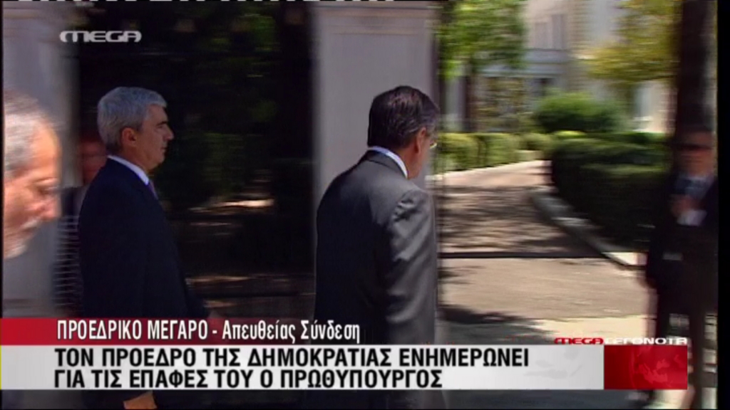 Το κατώφλι του Προεδρικού Μεγάρου διάβηκε πριν από λίγα λεπτά ο Αντώνης Σαμαράς στο πλαίσιο προγραμματισμένης συνάντησης με τον Κάρολο Παπούλια.Ο Έλληνας πρωθυπουργός ενημερώνει τον Πρόεδρο της Δημοκρατίας για τις επαφές του σε Βερολίνο και Παρίσι.