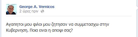 Με τους φίλους του στο facebook μοιράστηκε την πρόταση που δέχθηκε να αναλάβει, σύμφωνα με πληροφορίες, τη θέση του υφυπουργού Ναυτιλίας, ο εφοπλιστής Γιώργος Βερνίκος…