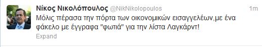 Στον οικονομικό εισαγγελέα βρίσκεται αυτή την ώρα ο Νίκος Νικολόπουλος, για τη λίστα Λαγκάρντ, όπως ο ίδιος ενημερώνει μέσω twitter.