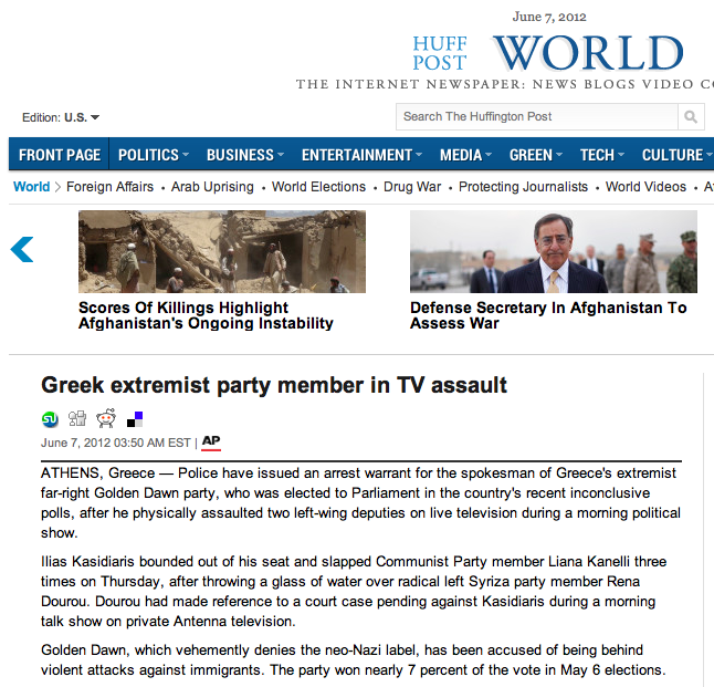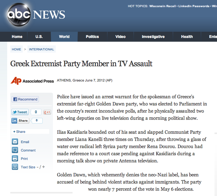 Ήδη το πρακτορείο Associated Press έχει παρουσιάσει την είδηση για την επίθεση του Ηλία Κασιδιάρη στη Λιάνα Κανέλλη, μετά από λογομαχία. Αμέσως την είδηση την έπαιξε και το ABC News και η Huffington Post, με πηγή το Associated Press…Η είδηση φέρει τον τίτλο “Έλληνας εξτρεμιστής, μέλος κόμματος σε τηλεοπτική επίθεση”