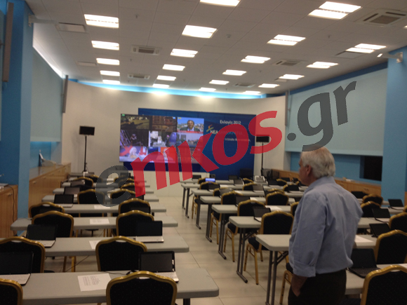 Το κέντρο Τύπου στα γραφεία της Νέας Δημοκρατίας. Ο πρόεδρος του κόμματος Αντώνης Σαμαράς έφτασε στη Συγγρού δέκα λεπτά πριν από τις 5 το απόγευμα.