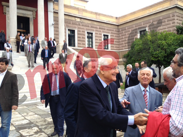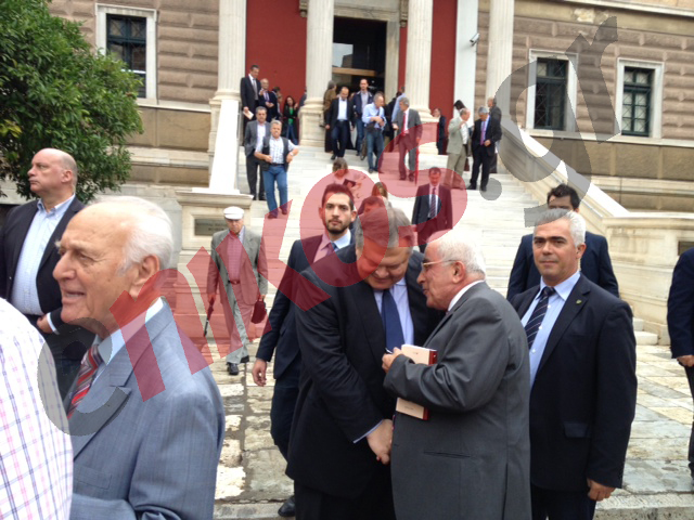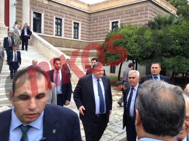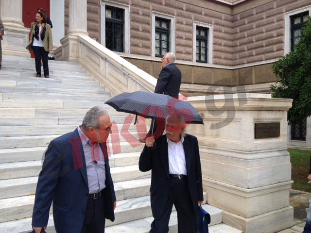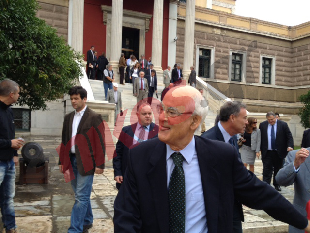 Εξω από την Παλαιά Βουλή, σε …χαλαρή διάθεση ο Ευάγγελος Βενιζέλος, ο Απόστολος Κακλαμάνης και ο Μανόλης Γλέζος, μετά την παρουσίαση της βιογραφίας του πρώην Προέδρου της Δημοκρατίας Κωστή Στεφανόπουλου.