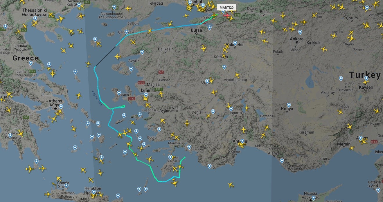 Πρωτοφανής πρόκληση από κατασκοπευτικό αεροσκάφος τύπου CN235 της τουρκικής πολεμικής αεροπορίας. Όπως φαίνεται και στο γράφημα, ξεκίνησε από την αεροπορική βάση του Νταλαμάν για να καταλήξει στο αεροδρόμιο Γκιολτσούκ (Νικομήδεια), αφού προηγουμένως «έκοψε» το Αιγαίο στη μέση.