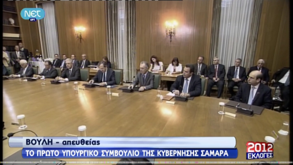 “Σήμερα είναι μια νέα μέρα για τον τόπο. Η χώρα αποκτά μετά από πολύ καιρό κανονική κυβέρνηση. Αλλά σήμερα και είναι και μια αρχή νέας εποχής γιατί συγκροτείται κυβέρνηση με διακομματική σύνθεση. Παλαιότερα αυτό συνέβη σπάνια. Τώρα συγκροτείται κυβέρνηση με πλήρεις αρμοδιότητες. Είναι ένα μεγάλο βήμα που προϋποθέτει τολμηρές συναίνεσεις μεταξύ των κομμάτων”, τόνισε μεταξύ άλλων ο πρωθυπουργός. Δείτε το βίντεο με την εισαγωγική τοποθέτηση του Αντώνη Σαμαρά στο πρώτο υπουργικό συμβούλιο που ολοκληρώθηκε πριν από λίγο. Προηγήθηκε η ορκωμοσία της νέας κυβέρνησης και αφού τα μέλη της κυβέρνησης Σαμαρά περπάτησαν από το Προεδρικό Μέγαρο στη Βουλή, ξεκίνησε το υπουργικό συμβούλιο. Δείτε το βίντεο με τα πλάνα της αποχώρησης των μελών της κυβέρνησης από το Προεδρικό Μέγαρο και της μετάβασής τους στη βουλή για το υπουργικό συμβούλιο. Συνολικά η κυβέρνηση αποτελείται από 19 υπουργεία και θα μετέχουν 39 άτομα. Πιο συγκεκριμένα, στο σχήμα μετέχουν 17 Υπουργοί, 6 Αναπληρωτές Υπουργοί και 15 Υφυπουργοί.