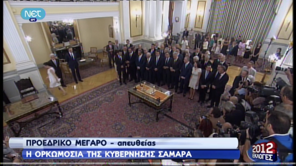 Υφυπουργός Γιώργος Βερνίκος Υπουργός Τουρισμού Όλγα Κεφαλογιάννη Υπουργείο Μακεδονίας Θράκης Καράογλου Θεόδωρος Κυβερνητικός Εκπρόσωπος Σίμος Κεδίκογλου Για πρόεδρος της Βουλής θα προταθεί ο Βαγγέλης Μεϊμαράκης.Ο κ. Ράπανος, ο κ. Μαυραγάννης και ο κ. Κούρκουλας δεν ορκίστηκαν σήμερα. Πριν την είσοδό του στο Προεδρικό Μέγαρο για την έναρξη της ορκωμοσίας ο πρωθυπουργός Αντώνης Σαμαράς έκανε δηλώσεις στα Διεθνή ΜΜΕ. Τελευταίος, με ταξί, έφτασε στο Προεδρικό Μέγαρο, ο νέος υπουργός Δικαιοσύνης Αντώνης Ρουπακιώτης. Πολλά από τα μέλη της κυβέρνησης έκαναν δηλώσεις, προσερχόμενοι, πριν ορκιστούν. Δείτε τις δηλώσεις μερικών εξ’ αυτών. Tο μήνυμα του Αρχιεπισκόπου Αθηνών και Πάσης Ελλάδος για τον ελληνικό λαό και οι ευχές του στη νέα κυβέρνηση. Δείτε το βίντεο της ανακοίνωσης της κυβέρνησης από το νέο κυβερνητικό εκπρόσωπο Σίμο Κεδίκογλου