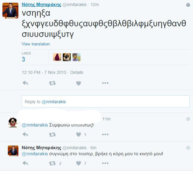 Όλοι κατάλαβαν πως επρόκειτο περί λάθος και ο ίδιος ο βουλευτής της ΝΔ λίγο αργότερα έδωσε την απάντηση. “Συγγνώμη στο Twitter. Βρήκε η κόρη μου το κινητό μου”.