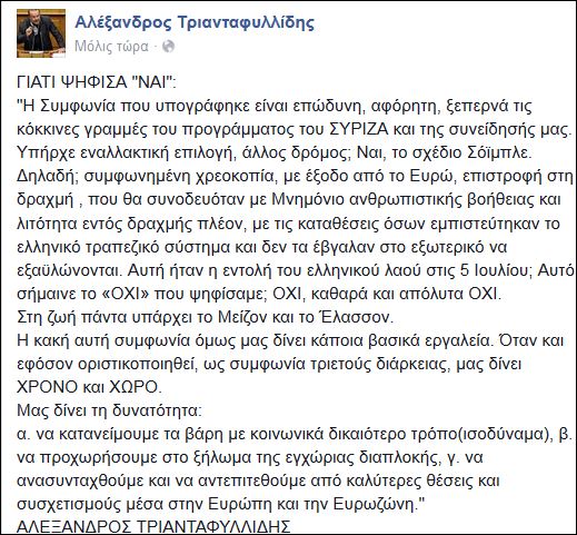 Τους λόγους που τον έκαναν να ψηφίσει «ΝΑΙ» στη ψηφοφορία που πραγματοποιήθηκε τα ξημερώματα της Πέμπτης στη Βουλή για τα προαπαιτούμενα ανέφερε ο Αλέξανδρος Τριανταφυλλίδης με ανάρτησή του στο Facebook