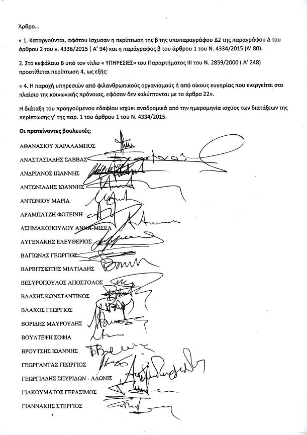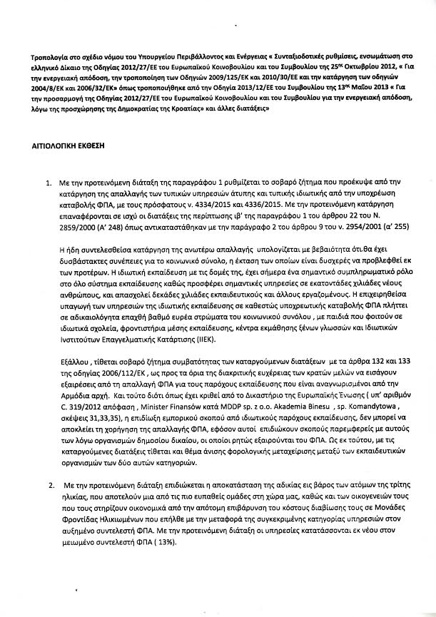 Με επικεφαλής τον πρόεδρο της Νέας Δημοκρατίας Ευάγγελο Μεϊμαράκη, η Κοινοβουλευτική Ομάδα του κόμματος κατέθεσε τροπολογία στο σχέδιο νόμου του υπουργείου Περιβάλλοντος και Ενέργειας, που συζητείται στη Βουλή. Η τροπολογία προβλέπει την κατάργηση του ΦΠΑ στην ιδιωτική εκπαίδευση, καθώς και τη μείωση του ΦΠΑ στις μονάδες φροντίδας ηλικιωμένων.