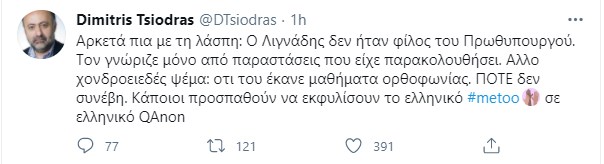 «Αρκετά πια με τη λάσπη: Ο Λιγνάδης δεν ήταν φίλος του Πρωθυπουργού. Τον γνώριζε μόνο από παραστάσεις που είχε παρακολουθήσει. Άλλο χονδροειδές ψέμα: ότι του έκανε μαθήματα ορθοφωνίας. ΠΟΤΕ δεν συνέβη. Κάποιοι προσπαθούν να εκφυλίσουν το ελληνικό #metoo σε ελληνικό QAnon».