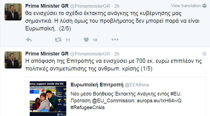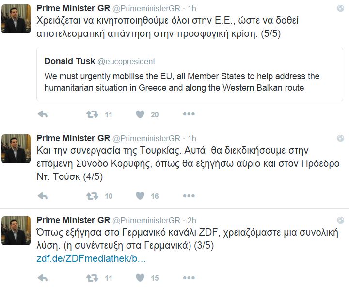 Με πέντε αναρτήσεις στο twitter o Πρωθυπουργός, Αλέξης Τσίπρας προσδιόρισε τους ελληνικούς στόχους και το διαπραγματευτικό πλαίσιο εν όψει Συνόδου Κορυφής σε σχέση με τη προσφυγική κρίση.