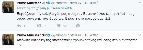 Με ανάρτησή του στο twitter o Πρωθυπουργός Αλέξης Τσίπρας καταδικάζει την αιματηρή επίθεση κατά τη διάρκεια συναυλίας στο Μάντσεστερ και εκφράζει την αλληλεγγύη του προς τον βρετανικό λαό.