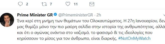 Τη μνήμη των θυμάτων του Ολοκαυτώματος τιμά ο πρωθυπουργός, Αλέξης Τσίπρας, με αφορμή, τη σημερινή ημέρα μνήμης, σε ανάρτησή του στο Twitter.