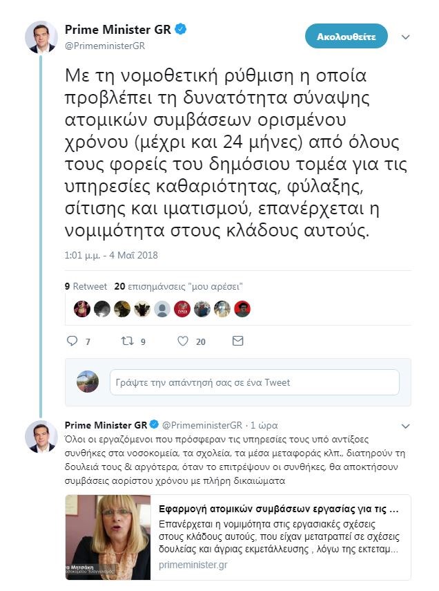 Στις πρωτοβουλίες της κυβέρνησης για τους εργαζόμενους στη φύλαξη, στην καθαριότητα, στη σίτιση και τον ιματισμό στο δημόσιο τομέα, αναφέρεται ο Αλέξης Τσίπρας με ανάρτησή του στο twitter, στο πλαίσιο των σποτ “Ήταν δίκαιο και έγινε πράξη”.