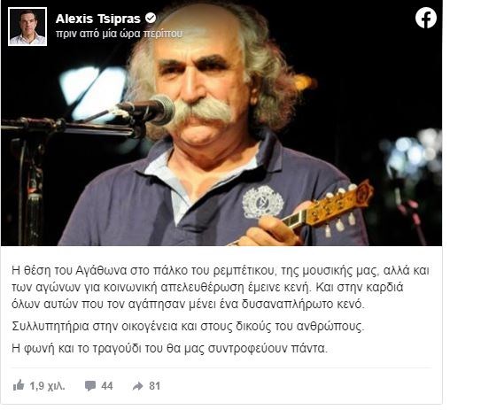 «Η θέση του Αγάθωνα στο πάλκο του ρεμπέτικου, της μουσικής μας, αλλά και των αγώνων για κοινωνική απελευθέρωση έμεινε κενή. Και στην καρδιά όλων αυτών που τον αγάπησαν μένει ένα δυσαναπλήρωτο κενό», αναφέρει ο Αλέξης Τσίπρας για τον θάνατο του ρεμπέτη Αγάθωνα. Με την ανάρτηση του στα μέσα κοινωνικής δικτύωσης, ο πρόεδρος του ΣΥΡΙΖΑ εκφράζει τα συλλυπητήρια του στην οικογένεια και στους δικούς του ανθρώπους, σημειώνοντας ότι «η φωνή και το τραγούδι του θα μας συντροφεύουν πάντα».