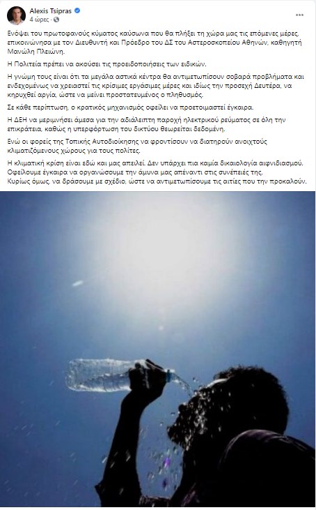 Επικοινωνία με τον Διευθυντή και Πρόεδρο του ΔΣ του Αστεροσκοπείου Αθηνών, καθηγητή Μανώλη Πλειώνη είχε ο πρόεδρος του ΣΥΡΙΖΑ Αλέξης Τσίπρας. Η επικοινωνία αφορούσε στο πρωτοφανές κύμα καύσωνα που άρχισε ήδη να πλήττει την χώρα.