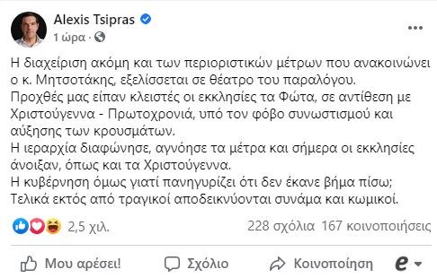 Όπως αναφέρει ο πρόεδρος του ΣΥΡΙΖΑ σε ανάρτησή του στο Facebook, “η διαχείριση ακόμη και των περιοριστικών μέτρων που ανακοινώνει ο κ. Μητσοτάκης, εξελίσσεται σε θέατρο του παραλόγου. Προχθές μας είπαν κλειστές οι εκκλησίες τα Φώτα, σε αντίθεση με Χριστούγεννα – Πρωτοχρονιά, υπό τον φόβο συνωστισμού και αύξησης των κρουσμάτων. Η ιεραρχία διαφώνησε, αγνόησε τα μέτρα και σήμερα οι εκκλησίες άνοιξαν, όπως και τα Χριστούγεννα. Η κυβέρνηση όμως γιατί πανηγυρίζει ότι δεν έκανε βήμα πίσω; Τελικά εκτός από τραγικοί αποδεικνύονται συνάμα και κωμικοί”.