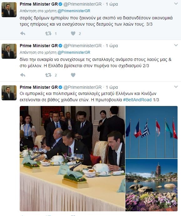 “Η Ελλάδα βρίσκεται στον πυρήνα του σχεδιασμού σειράς δρόμων εμπορίου που ξεκινούν με σκοπό να διασυνδέσουν οικονομικά τρεις ηπείρους και να ενισχύσουν τους δεσμούς των λαών τους» καταλήγει ο Πρωθυπουργός.