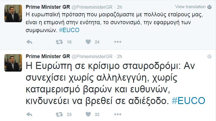«Η Ευρώπη σε κρίσιμο σταυροδρόμι: Αν συνεχίσει χωρίς αλληλεγγύη, χωρίς καταμερισμό βαρών και ευθυνών, κινδυνεύει να βρεθεί σε αδιέξοδο» έγραψε ο Έλληνας πρωθυπουργός.