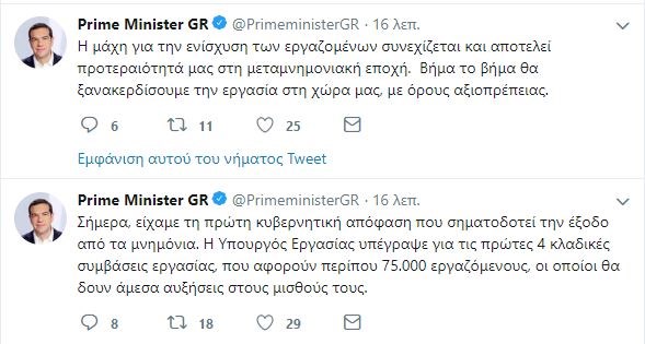 Απόφαση «που σηματοδοτεί την έξοδο από τα μνημόνια» χαρακτηρίζει ο Αλέξης Τσίπρας τη σημερινή υπογραφή των πρώτων τεσσάρων κλαδικών συμβάσεων εργασίας με την οποία, όπως αναφέρει, περίπου 75.000 εργαζόμενοι θα δουν άμεσα αυξήσεις στους μισθούς τους.Με αναρτήσεις του στο Twitter ο πρωθυπουργός σημειώνει ότι «η μάχη για την ενίσχυση των εργαζομένων συνεχίζεται και αποτελεί προτεραιότητά μας στη μεταμνημονιακή εποχή».Δείτε τα tweets του Αλέξη Τσίπρα: